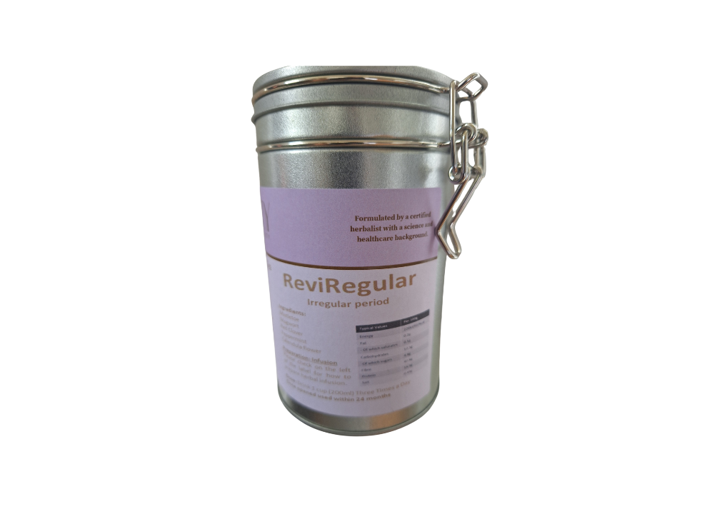 Prise en charge d'un cycle mensuel régulier \n \n Revity présente ReviLance, une infusion de plantes soigneusement mélangée conçue pour aider à la régularisation de votre cycle menstruel mensuel. \n \n Informations nutritionnelles \n \n Valeurs typiques pour 100 ml d'infusion infusée : \n \n \n Énergie 226kj/937kCal \n Lipides 0,2g \n - dont saturés 0,1g \n Glucides 17,3g \n - dont sucres 4,8 g \n Fibres alimentaires 47,8 g \n Protéines 14,9 g \n Sel 0,49 g \n \n Sans sel ni sucre ajoutés \n \n Les valeurs nutritionnelles sont 100 % naturelles
